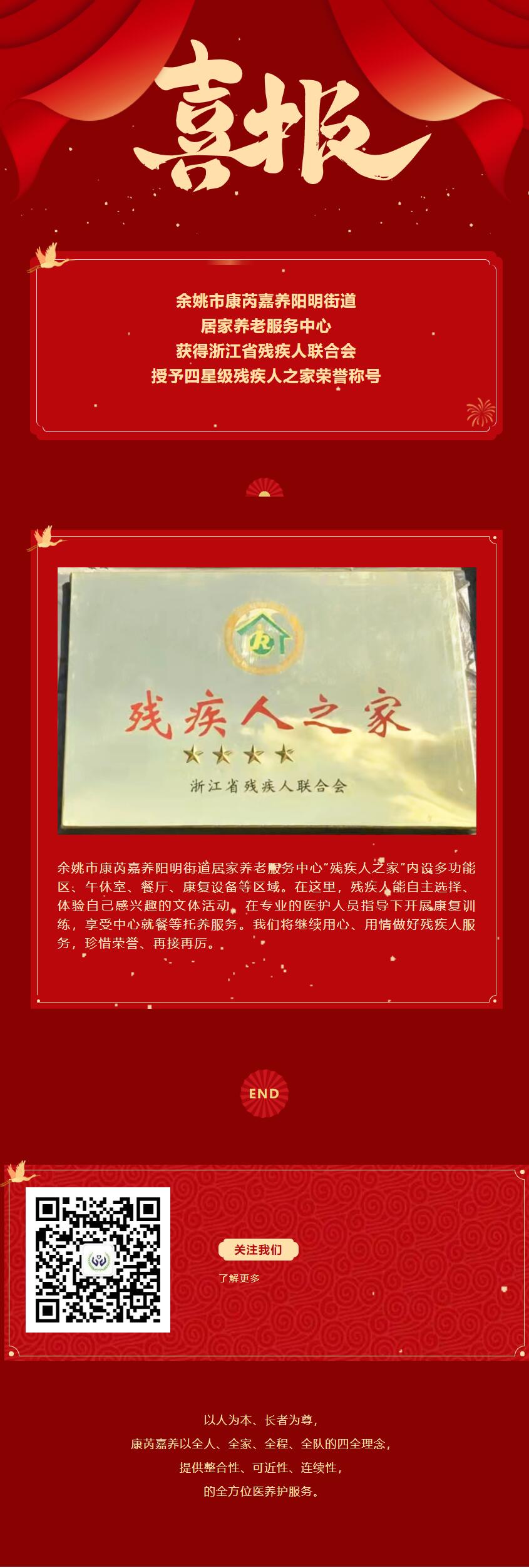 余姚市康芮嘉养阳明街道居家养老服务中心获得浙江省残疾人联合会授予四星级残疾人之家荣誉称号