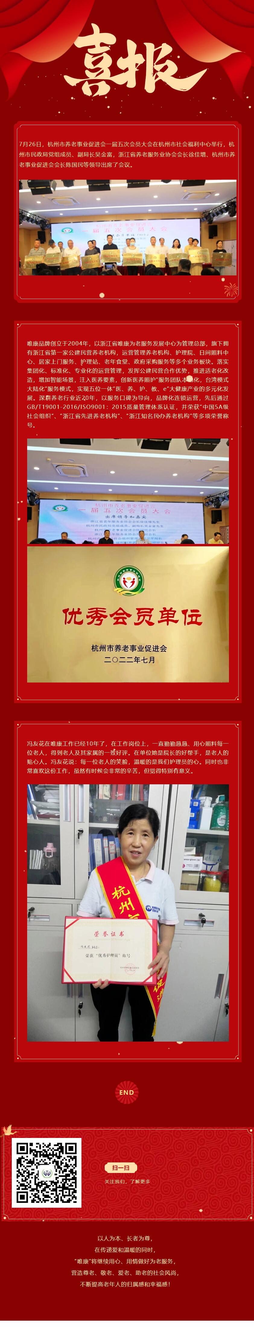 【喜报】浙江省唯康为老服务发展中心荣获杭州市养老事业促进会授予优秀会员单位、冯友花荣获优秀护理员