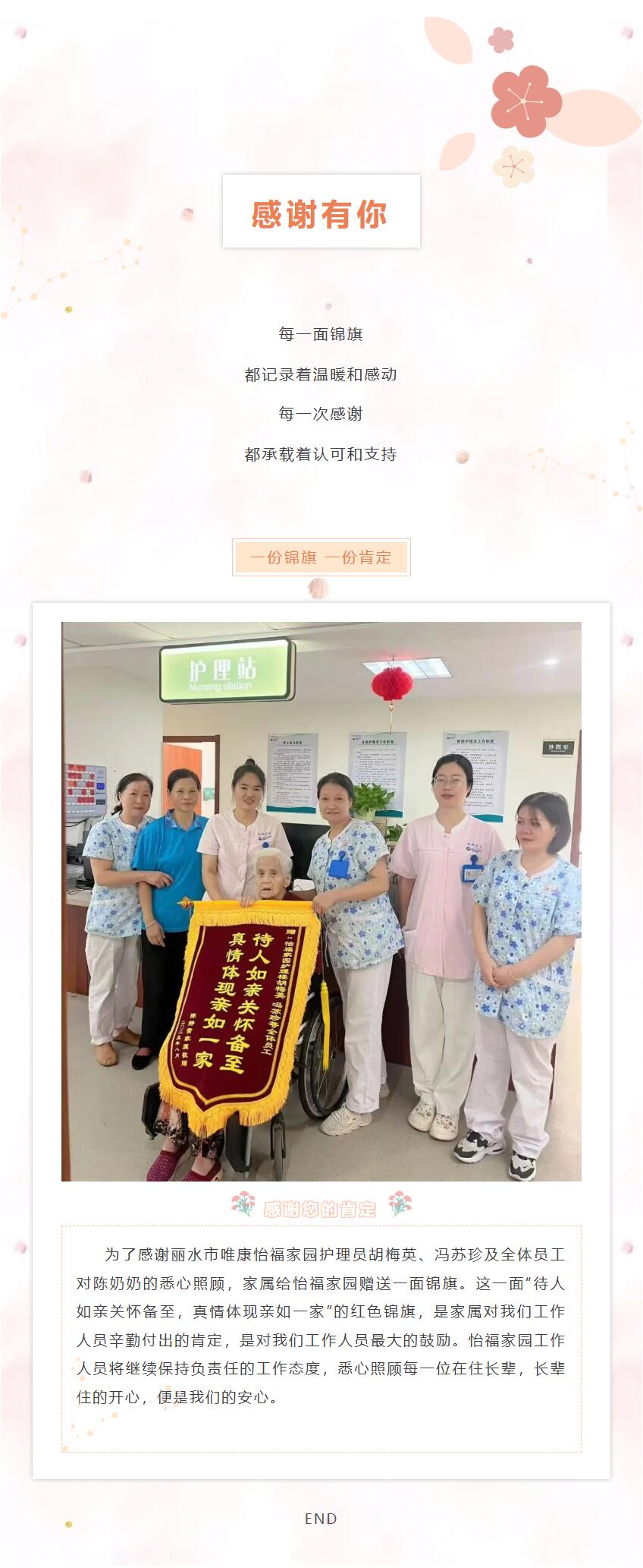一面锦旗、一份肯定——丽水市唯康怡福家园收到家属亲赠锦旗一面