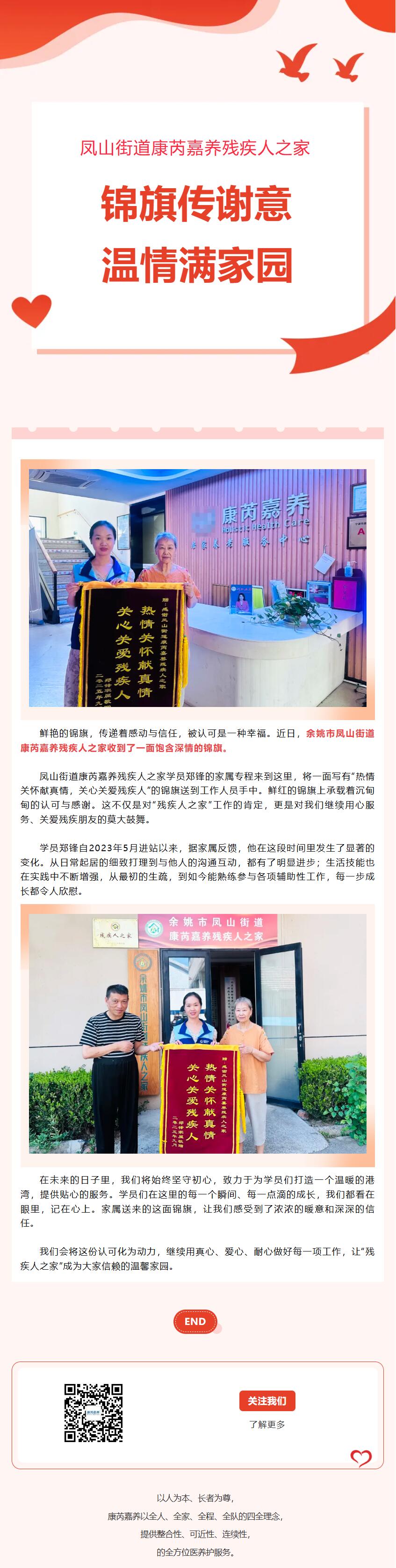 锦旗传谢意,温情满家园——余姚市凤山街道康芮嘉养残疾人之家收到家属致谢锦旗